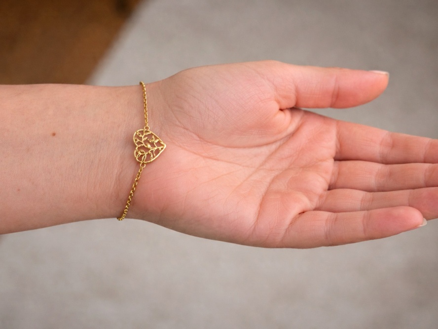 Subtelna i pełna uroku pozłacana bransoletka ze srebra próby 925 z motywem serca otoczonego liśćmi to biżuteria, która łączy romantyczny akcent z delikatną inspiracją naturą. Złocone wykończenie nadaje jej ciepłego blasku, a lekka forma sprawia, że bransoletka pięknie układa się na nadgarstku i świetnie sprawdza się w codziennym noszeniu.