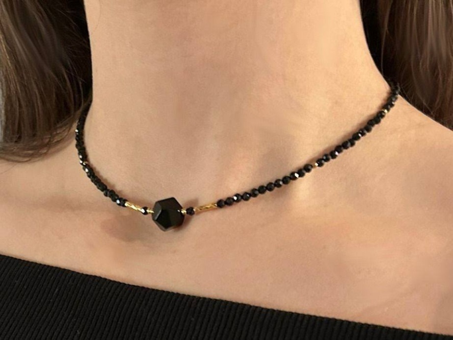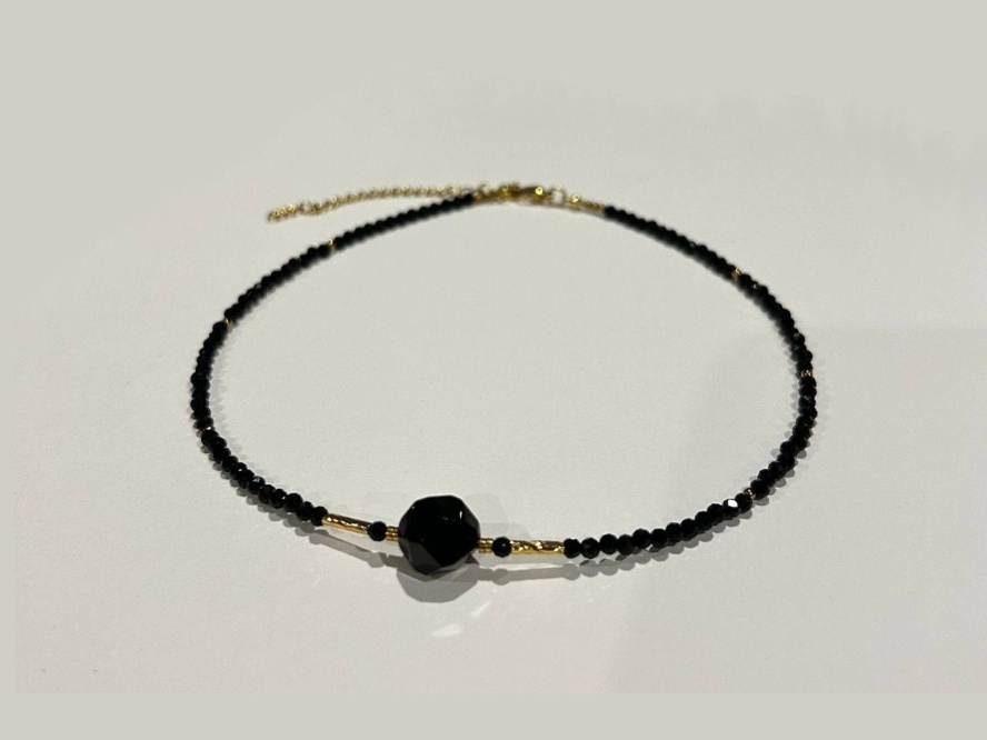 Ręcznie wykonany choker z kamieni naturalnych - czarnego turmalinu, onyksu i hematytu, całość wykończona stalą szlachetną. Subtelna forma i głęboka czerń kamieni sprawiają, że jest to elegancki dodatek, idealny również jako akcent do sylwestrowej stylizacji.
