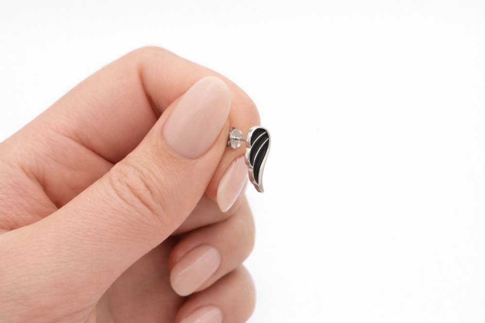 Dodaj swojemu lookowi wyjątkowego charakteru i subtelnej elegancji dzięki tym unikalnym kolczykom w kształcie skrzydeł. Wykonane z wysokiej jakości srebra próby 925, ozdobione głęboką czarną emalią, kolczyki łączą klasyczny materiał z nowoczesnym, stylowym akcentem.