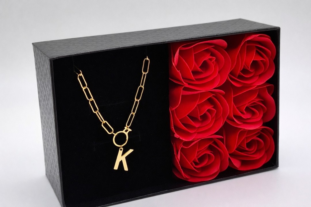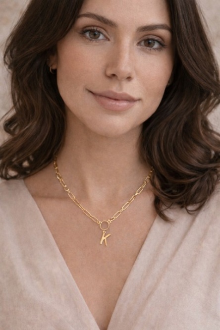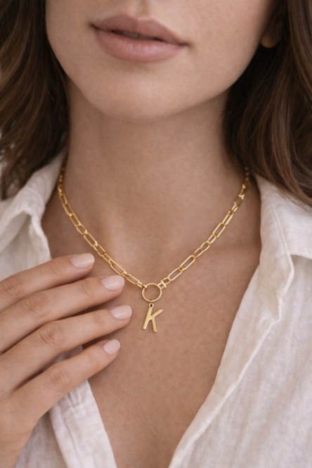 Centralnym elementem naszyjnika jest literka „K” zawieszona na łańcuszku z ozdobnym kółkiem, co nadaje mu nowoczesny, minimalistyczny design. Taki motyw doskonale sprawdzi się jako personalizowany dodatek – zarówno dla siebie, jak i jako wyjątkowy prezent dla bliskiej osoby, podkreślając indywidualność i więź.