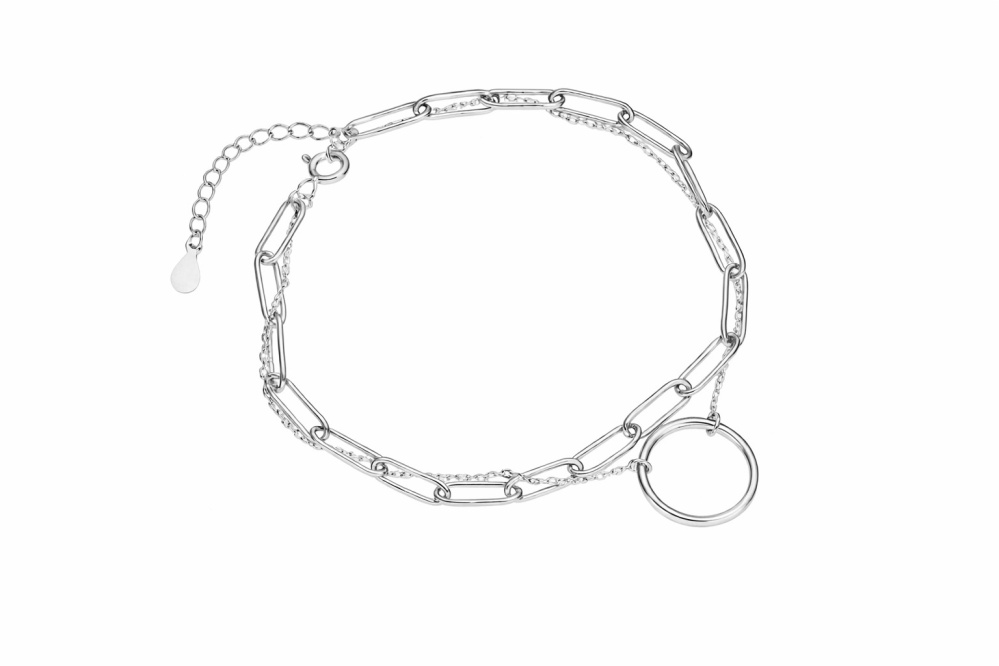 Bransoletka łączy w sobie dwa subtelne łańcuszki, które pięknie układają się na nadgarstku i delikatnie podkreślają jego kształt. Ozdobne kółko stanowi centralny element projektu — minimalistyczny, a jednocześnie efektowny detal, który przyciąga spojrzenia i nadaje całości nowoczesnego charakteru.
