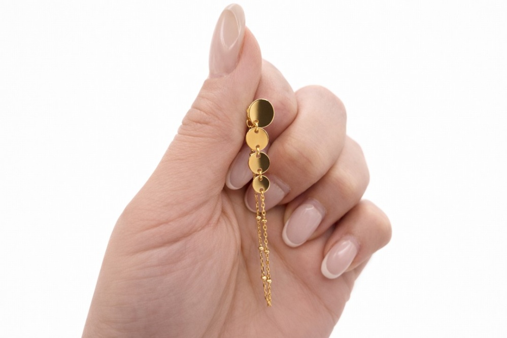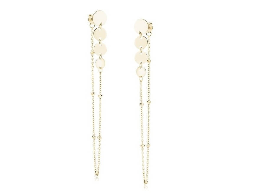 Model ma formę sztyftu, co zapewnia wygodę noszenia i stabilne zapięcie. Kompozycję tworzą drobne kółka o średnicach 7 mm, 6 mm, 6 mm i 5 mm, a całość dopełniają kuleczki o średnicy 2 mm. Dłuższa linia kolczyka wysmukla szyję i optycznie wydłuża sylwetkę – długość kolczyka to ok. 7,2 cm, a waga pary wynosi ok. 2,2 g, więc biżuteria jest efektowna, ale nadal lekka.