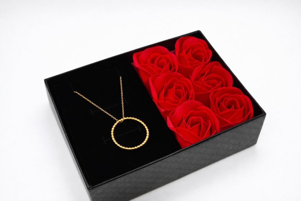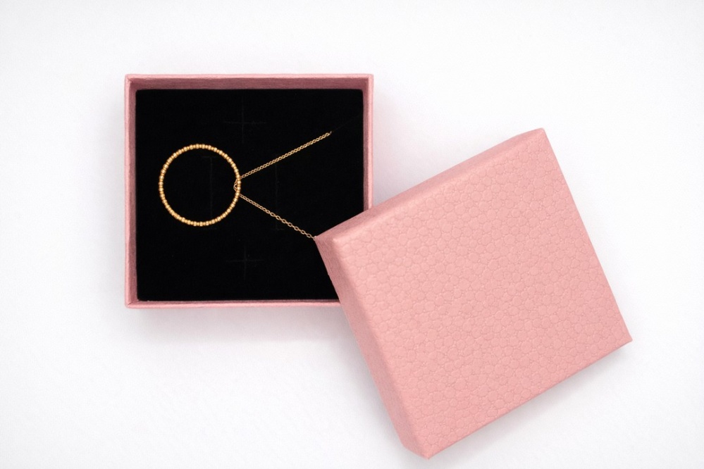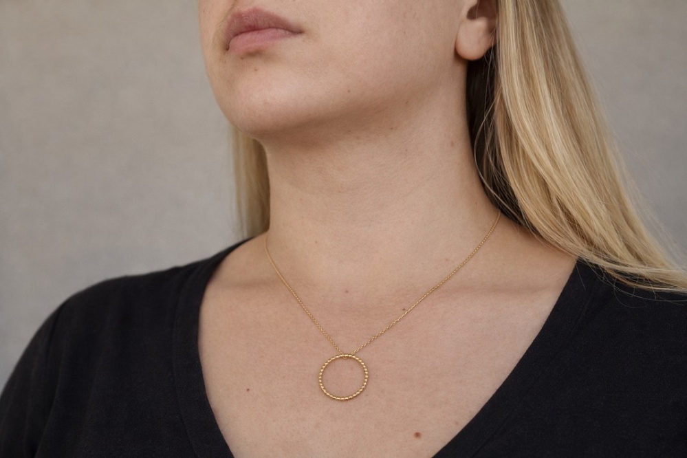 Centralnym elementem naszyjnika jest kółko ozdobione drobnymi kuleczkami, które tworzy ciekawą fakturę i dynamiczny efekt świetlny. Minimalistyczna forma sprawia, że naszyjnik jest uniwersalny — idealnie pasuje do codziennych zestawów, jak i bardziej eleganckich stylizacji. Dzięki swojej lekkiej konstrukcji noszenie go jest komfortowe przez cały dzień.