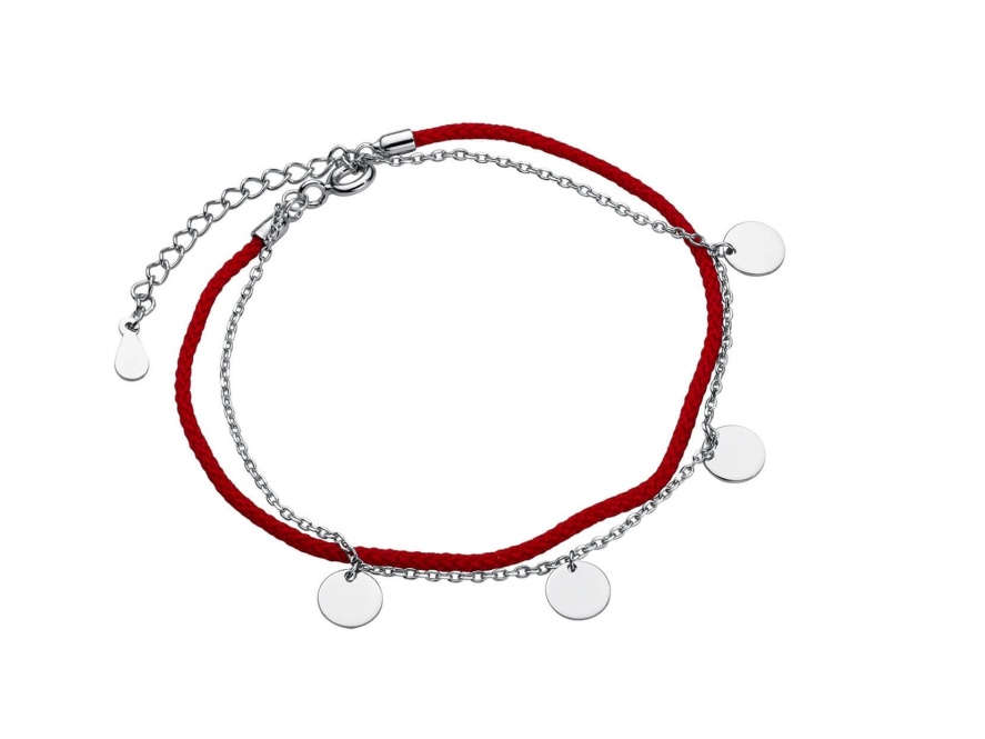 Rod- srebroSrebrna bransoletka pr. 925 z czerwonym sznurkiem i kółeczkami na łańcuszku — elegancja z nutą koloru