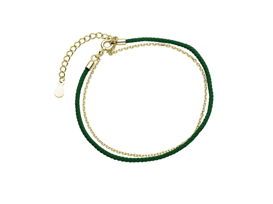 Srebrna bransoletka pr. 925 pozłacana z ciemnozielonym sznurkiem