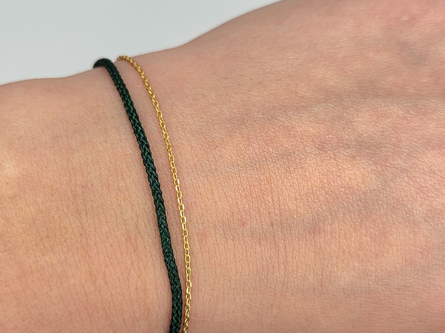 Srebrna bransoletka pr. 925 pozłacana z ciemnozielonym sznurkiem to doskonałe połączenie nowoczesnego minimalizmu i eleganckiej prostoty. Wykonana z wysokiej jakości srebra próby 925, ozdobiona pozłacanymi detalami, zachwyca trwałością i starannym wykończeniem. Ciemnozielony sznurek nadaje biżuterii wyjątkowego charakteru – jest stylowy, ponadczasowy i pięknie kontrastuje z ciepłym odcieniem złota.