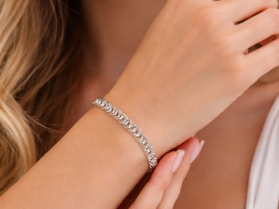 Bransoletka ozdobna srebrna Nonna pr. 925 to klasyczna biżuteria, która zachwyca efektownym splotem i eleganckim wyglądem. Wykonana z wysokiej jakości srebra próby 925 wyróżnia się trwałością, starannym wykończeniem oraz pięknym połyskiem. Splot Nonna to jeden z najbardziej dekoracyjnych i wyrazistych splotów łańcuszkowych – jego gęsta, symetryczna struktura sprawia, że bransoletka efektownie odbija światło i przyciąga uwagę.