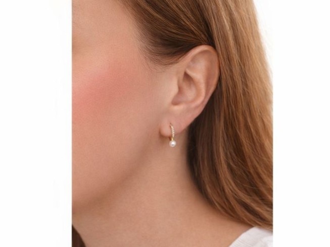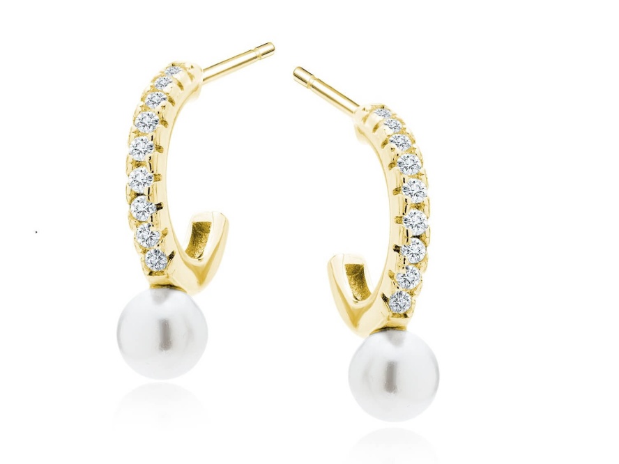 Srebrne pozłacane kolczyki próby 925 z perłą i białymi cyrkoniami to klasyka w eleganckim wydaniu. Subtelna perła (prasowana muszla) o średnicy 4 mm pięknie odbija światło, a drobne cyrkonie osadzone metodą microsetting dodają blasku bez efektu przesady.
